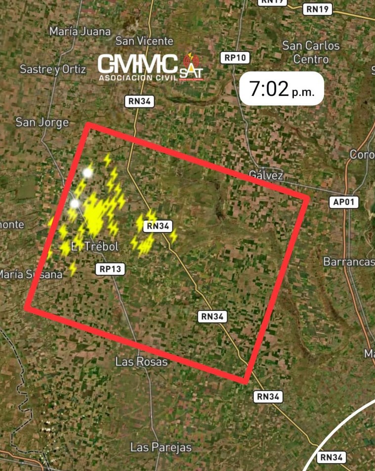 Atención El Trébol, Centeno, San Genaro y alrededores al este por actividad eléctrica intensa detectada en la zona. Probables chaparrones fuertes, ráfagas de viento y ocasional caída de granizo pequeño en los próximos 120 minutos.