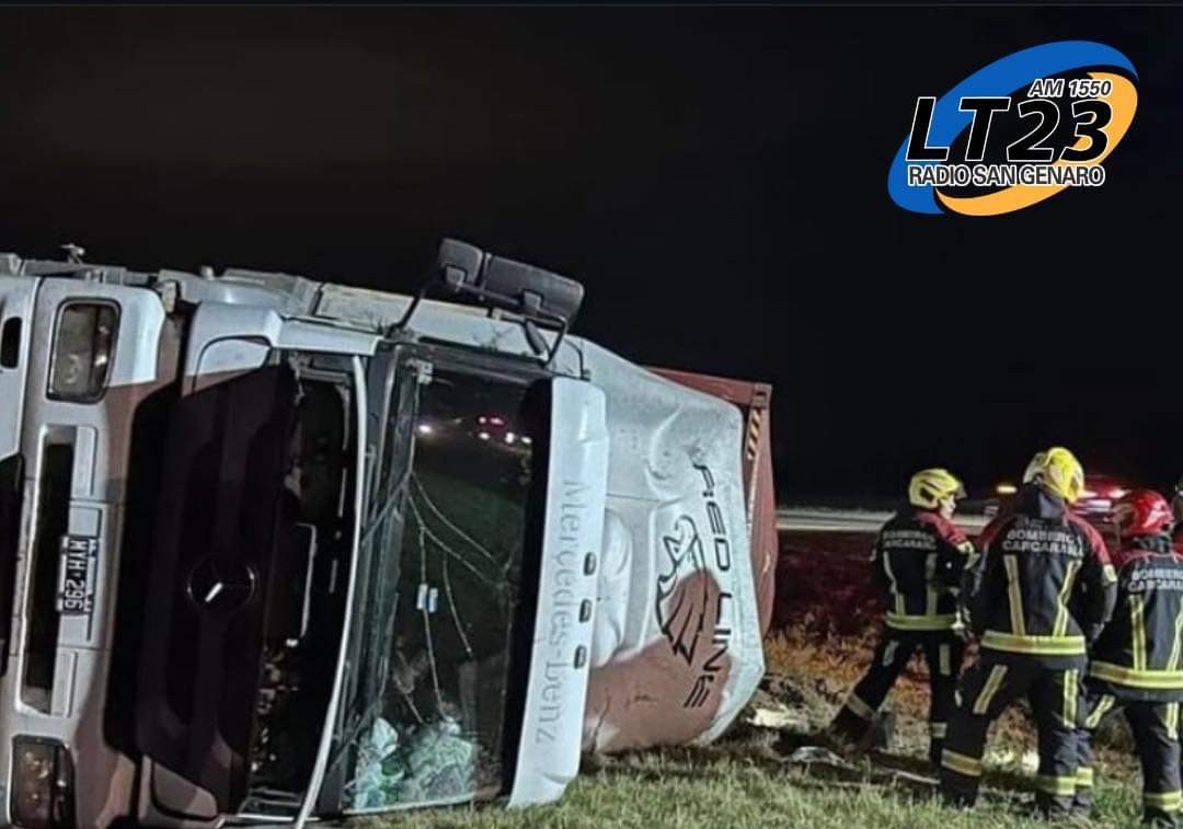 Los Bomberos Voluntarios de Carcarañá acudieron a la escena de un vuelco en el kilómetro 335 de la Autopista Rosario-Córdoba, en dirección ascendente. Al llegar al lugar, encontraron un camión volcado sobre el cantero central y parte de la calzada.