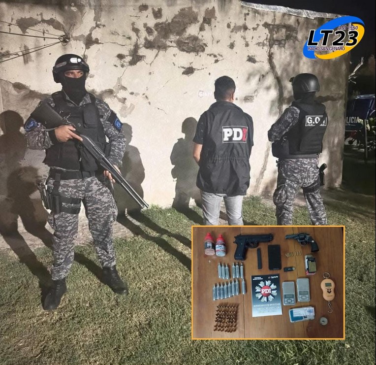 En el allanamiento la policía secuestró un revólver con 45 municiones calibre 22, 54 balas y una pistola 9 mm; otra pistola, calibre 4.5 con 14 municiones, esferas metálicas, 14 garrafas de dióxido de carbono co2, dos frascos con esferas metálicas, una balanza de precisión con vestigios de lo que sería cocaína, otras dos básculas y una balanza colgante, un picado gris, un pen drive, un teléfono celular y una moto marca Honda.