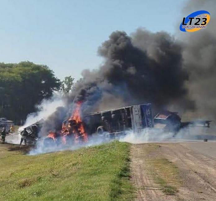 Acto seguido, uno de los camiones, el de mayor porte, terminó en la banquina incendiado, dejando un banco de humo que se podía ver a varios kilómetros. Sus ocupantes fueron consumidos por el fuego y murieron en el acto, según indicaron los Bomberos Voluntarios de Arrufó.