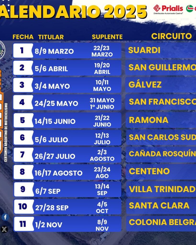 El 8 y 9 de marzo comienza la Temporada 2025 del Certamen Argentino de Motociclismo. La 1ª Fecha titular se correrá en el Circuito Jorge Marengo de Suardi, Santa Fe. Serán once (11) fecha en Suardi, San Guillermo, Gálvez, San Francisco, Ramona, San Carlos Sud, Cañada Rosquín, Centeno, Villa Trinidad, Santa Clara y Colonia Belgrano.