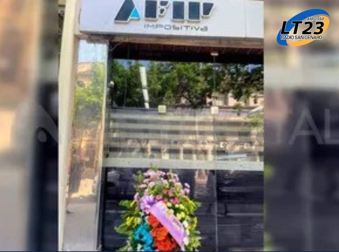 En Rosario, llegó una corona fúnebre al edificio de AFIP, con remitente del Partido Libertario de Santa Fe.