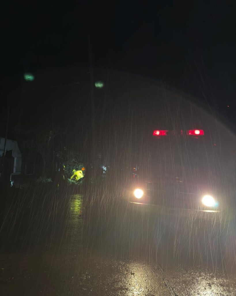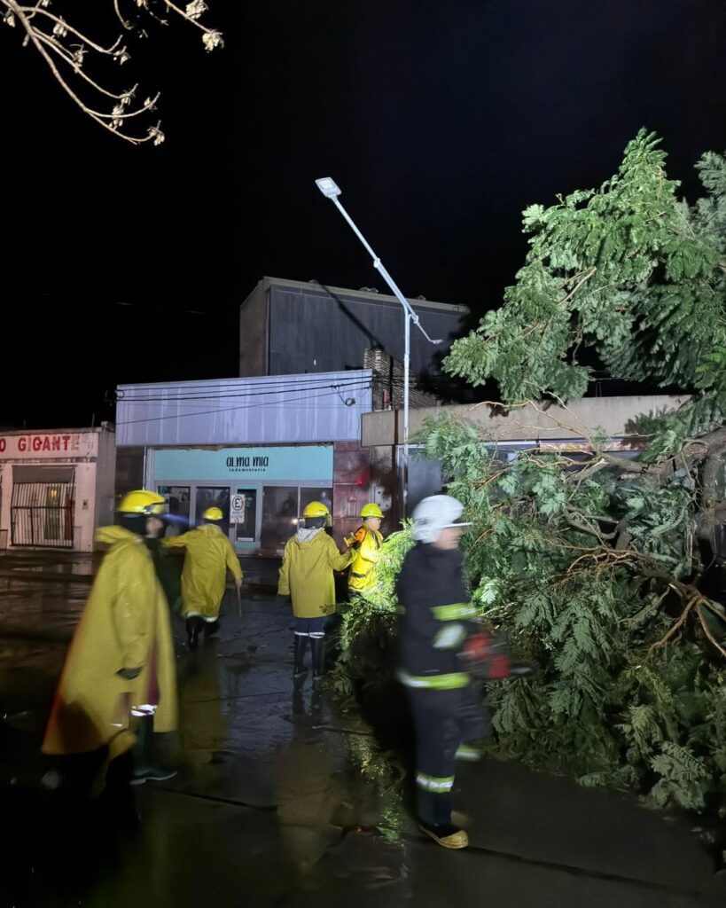 Mientras tanto, otra dotación permaneció trabajando dentro de la ciudad, realizando tareas de corte y remoción de árboles caídos, así como la liberación de calles anegadas, en respuesta a los daños provocados por el temporal.
