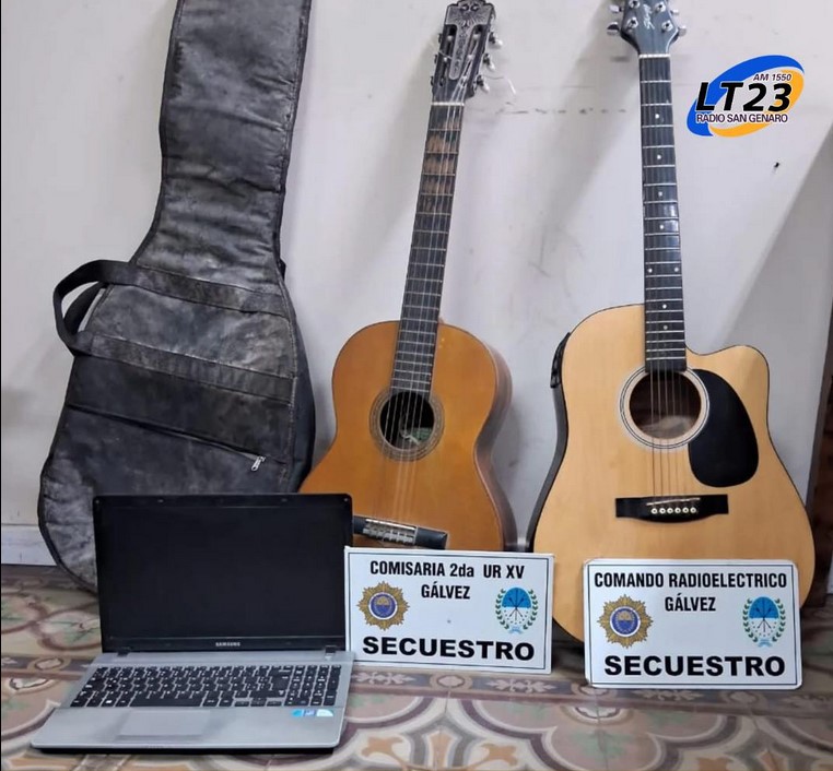 A posteriori, se registró otro domicilio en calle Alberdi, donde se procedió se secuestro de (01) una guitarra acústica negra y (01) una guitarra criolla de color marrón, las cuales fueron entregadas por un menor de edad resultando ser primo del anterior, siendo trasladado junto a su progenitora a fines de recepcionarle declaración respectiva. Se entabló comunicación telefónica con el Fiscal en turno Dr. Benítez, quien dispuso la detención de hombre mayor de edad. Se prosigue.