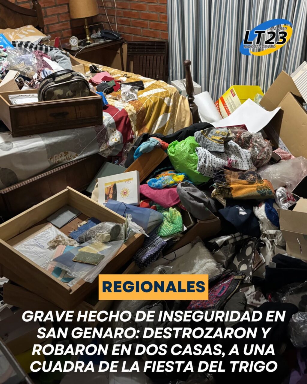 Un grave episodio de inseguridad se registró anoche en la ciudad de San Genaro, cuando delincuentes ingresaron a robar y provocaron importantes destrozos en dos viviendas ubicadas a tan solo una cuadra del predio donde se desarrollaba la tradicional Fiesta del Trigo.