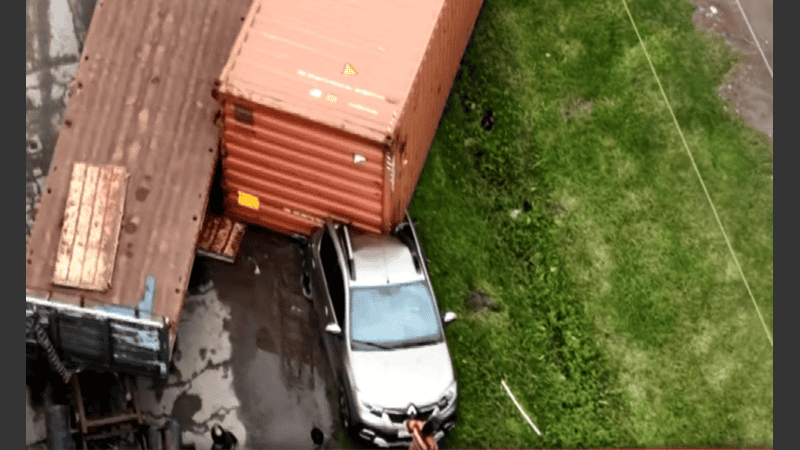Un impresionante siniestro se registró este mediodía en el camino viejo hacia Soldini, a la altura del kilómetro 2800, cuando un contenedor de aproximadamente 45 mil kilos cayó desde un camión sobre un automóvil.