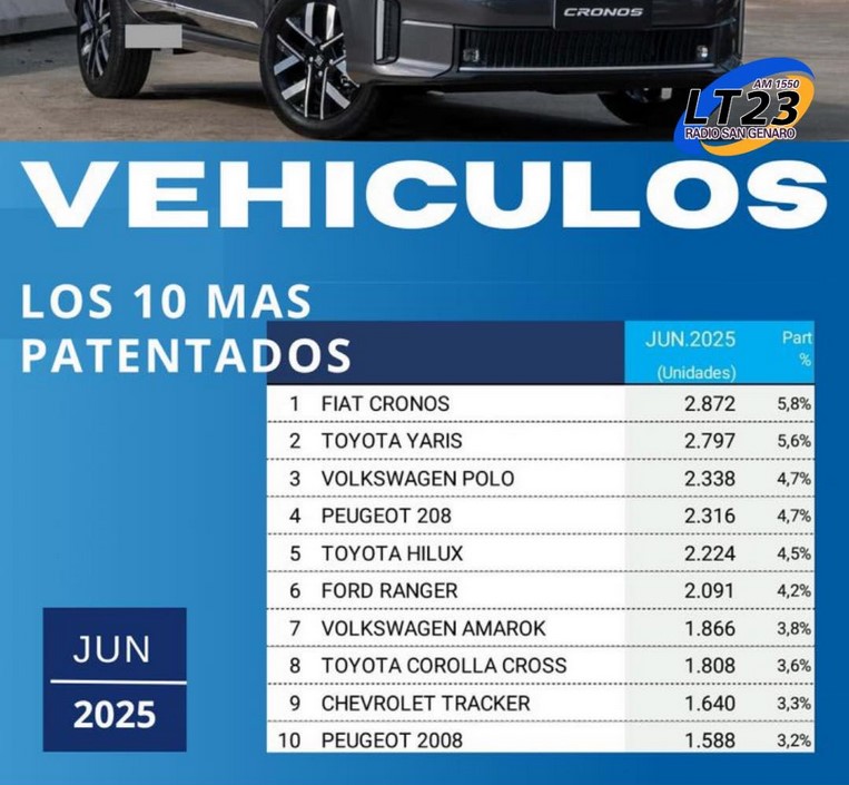 El vehículo más vendido de junio fue el Fiat Cronos, seguido por el Toyota Yaris y el Volkswagen Polo. Una señal de la apertura de importaciones, ya que los últimos dos se fabrican en Brasil.