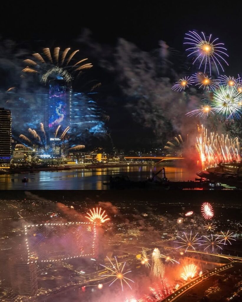 Drones forman figuras mientras explotan cohetes en la celebración de año nuevo en Barcelona, España.