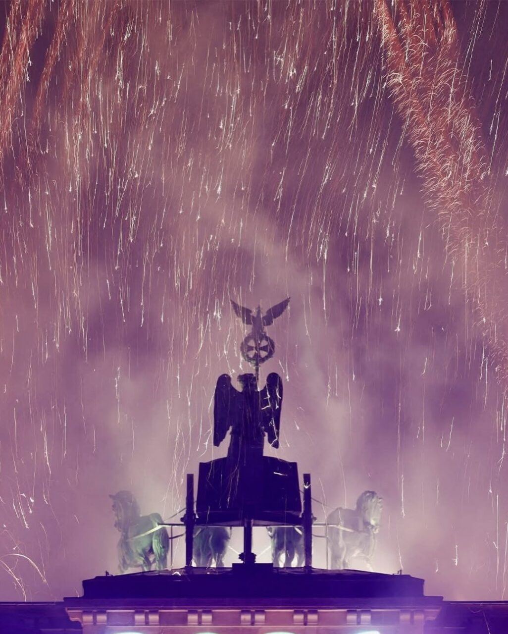 Fuegos artificiales explotan sobre la Puerta de Brandeburgo durante las celebraciones de Año Nuevo en Berlín, Alemania.