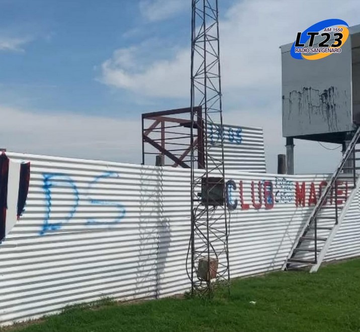 Así amaneció hoy la cancha de Club Maciel, con pintadas en su fachada, previo al clásico del próximo domingo frente a Alba.