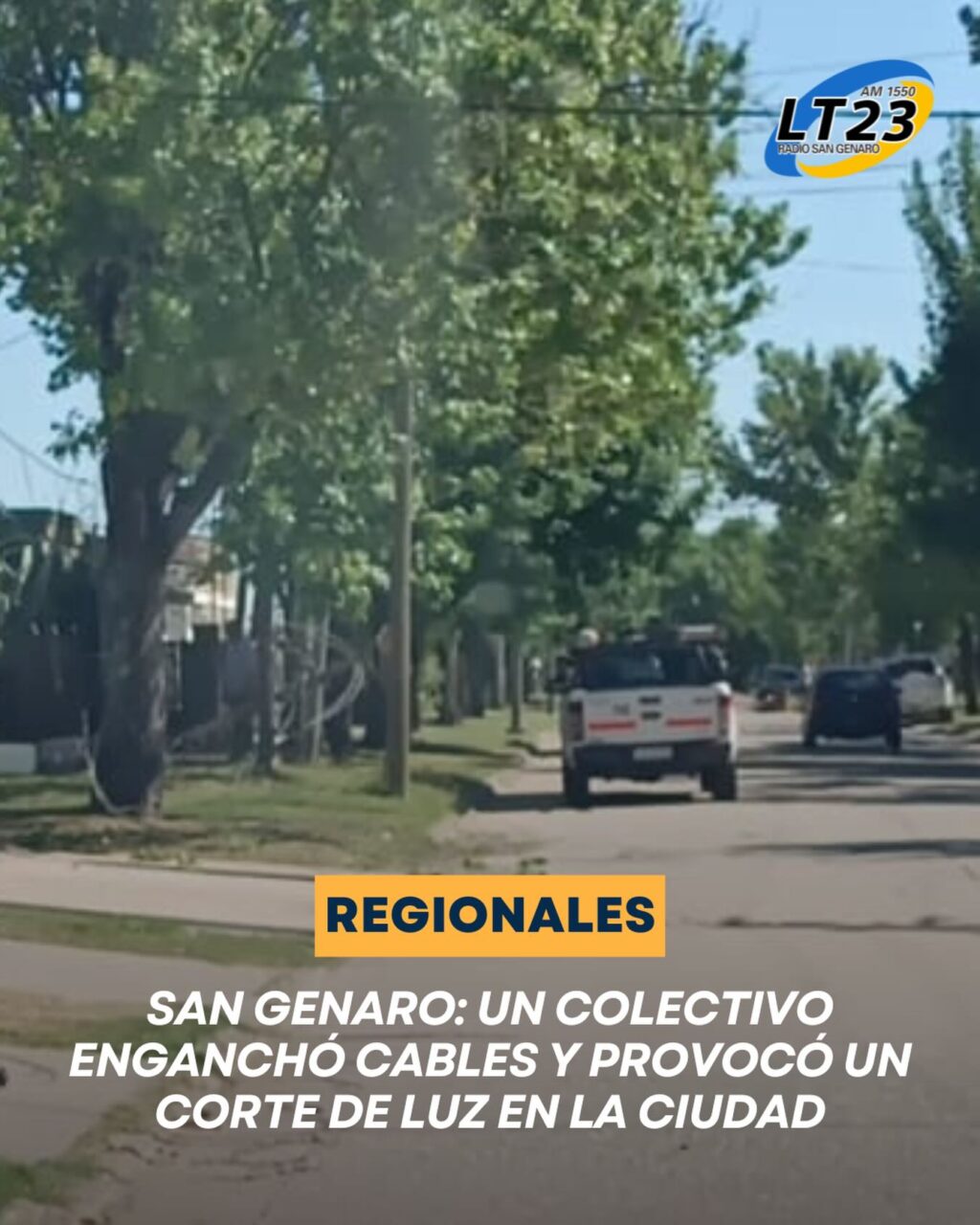 Un colectivo de una de las bandas que se presenta hoy en la Fiesta del Trigo protagonizó un incidente esta mañana en la intersección de Juan Cavarri y 25 de Mayo, al enganchar cables del tendido aéreo, lo que provocó un corte del suministro eléctrico que afecta a distintos sectores de la ciudad de San Genaro.