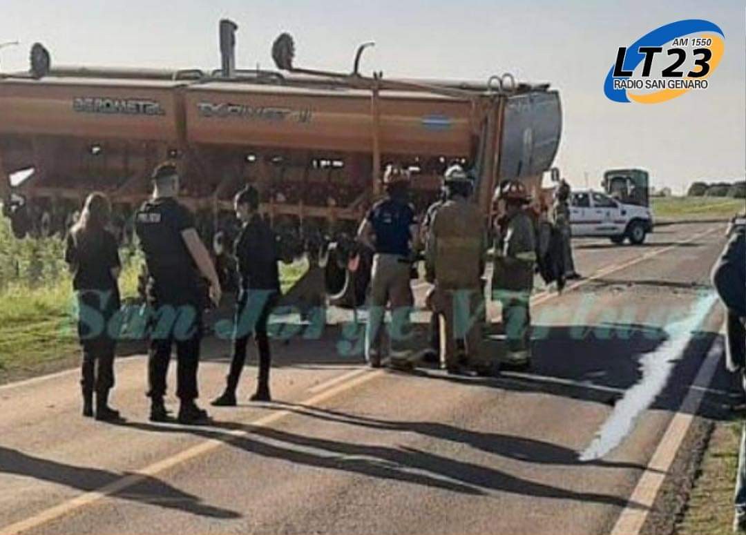 Bomberos tuvo que trabajar intensamente para remover la sembradora, la cual, quedó sobre la cinta asfáltica, dando lugar a tener que asistir el transito por el termino de un par de hora.