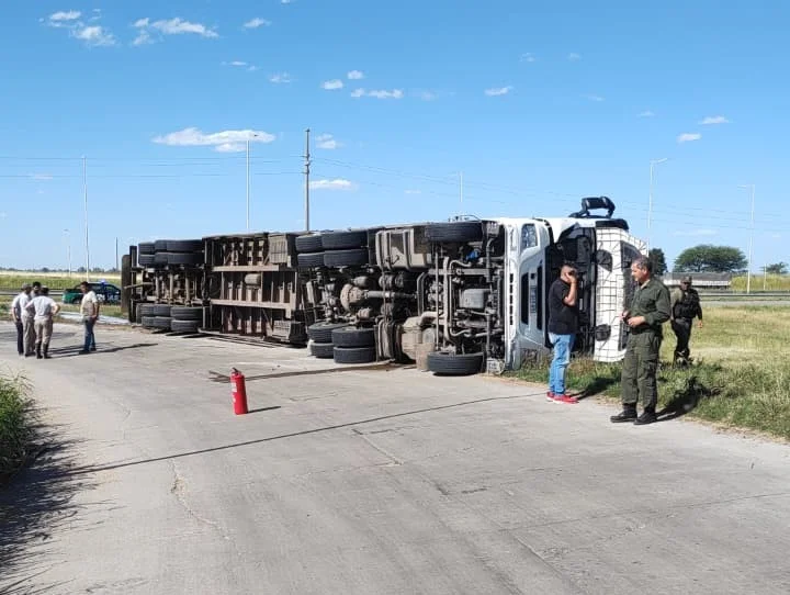 Un camión jaula que transportaba vacas volcó, aparentemente en solitario, en la Autopista Rosario – Córdoba sobre el acceso a la ruta 91.
