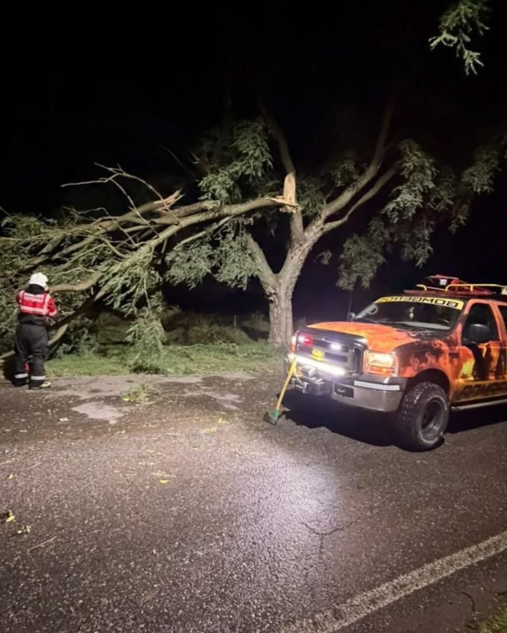 Se recibe llamado por voladura de techo en casa prefabricada sin habitantes y cable preensamblado cortado. Procedemos a establecer perímetro y cortar calles para que no circulen vehículos donde cayó el techo, luego vamos al acceso principal y se cortan ramas que dificultaban el paso en una de las manos. Sin más novedad se retorna al cuartel.