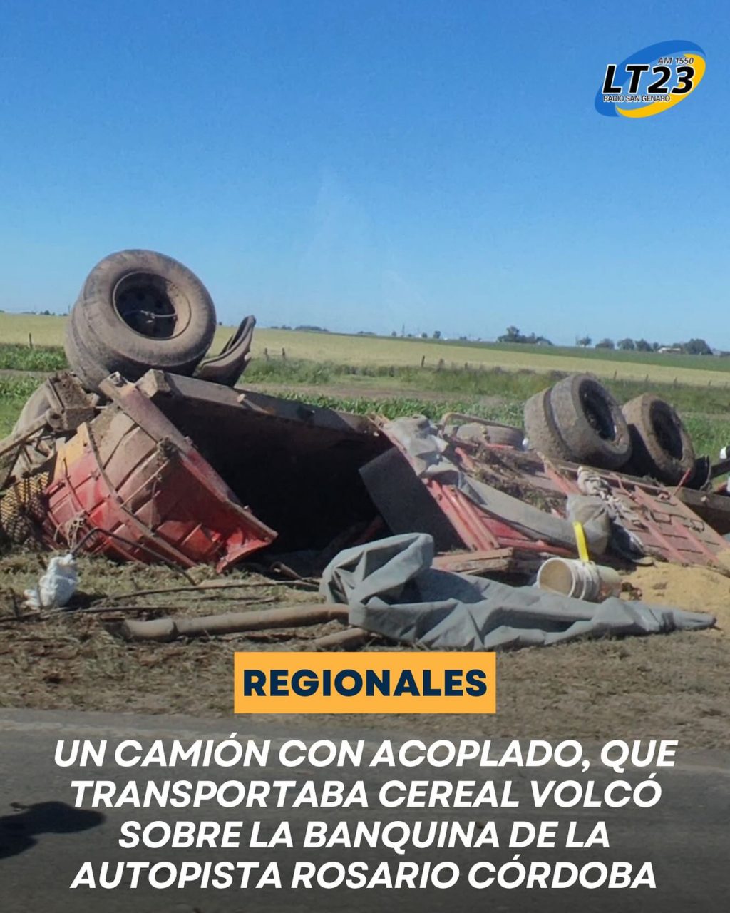 Un camión con acoplado, que transportaba cereal, volcó este fin de semana sobre la banquina de la autopista Rosario Córdoba, circulando hacia Rosario, pocos kilómetros después del cruce con Ruta S26 altura Carcarañá.